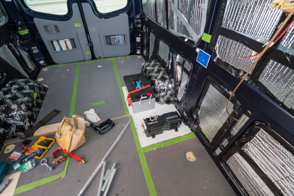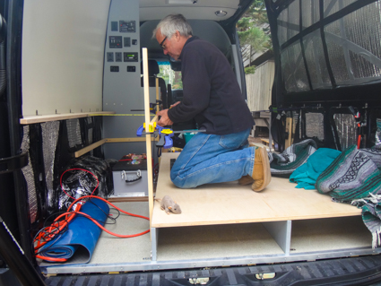 First we insulated the floor, then put 3/4" plywood down, including a 6" high second floor with space to stores skis, poles, chairs, a tent, some rugs, and anything else long and narrow.