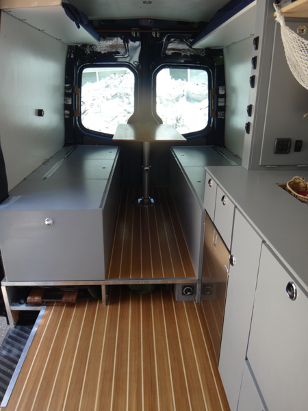 We spend a bit of time on our computers - writing and messing with photos - as well as planning routes on maps, so a decent sized table was a must. We mulled over a few ideas and decided to build a permanent table that swivels and drops down to help create the base for our bed.