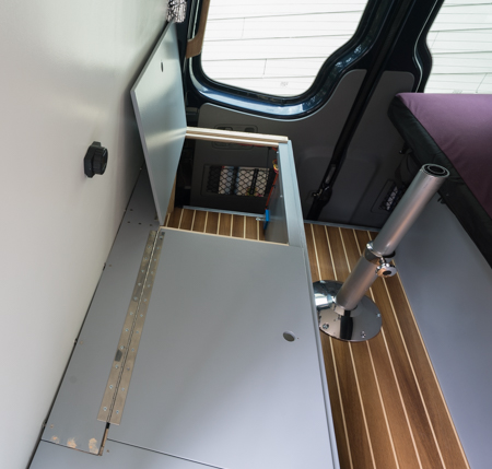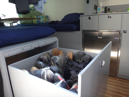 Another thing we carried over from the boat was a large storage locker for dirty or wet gear. On Tenaya, this was our cockpit locker. In the van, it is a deep drawer just inside the sliding door, under the starboard bunk. It's the perfect place to store shoes, daypacks, and dirty laundry.
