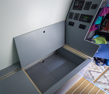 Jim built the starboard bench on the teak-and-holly sole and attached large hinged doors for easy access under both settees. There is also access from the rear when the doors are open.