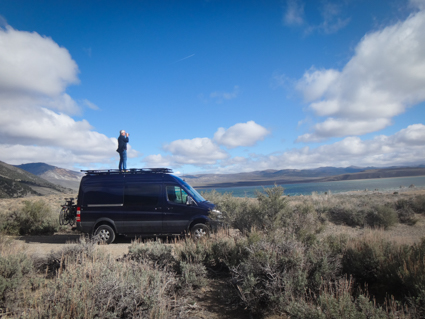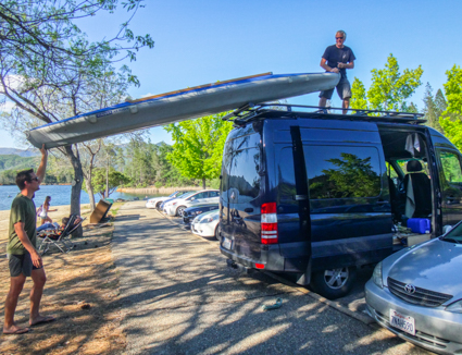 Aluminess extended the kayak rollers to protect the van's back-up camera. They also built crossbars to precisely fit our solar panel.