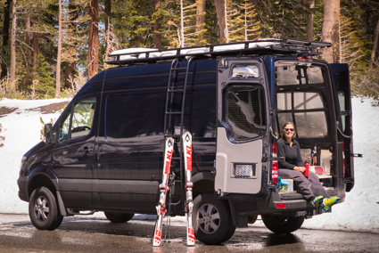 Aluminess extended the kayak rollers to protect the van's back-up camera. They also built crossbars to precisely fit our solar panel.
