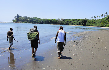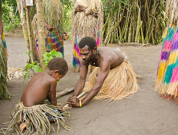 We walked two hours from Port Resolution to reach the traditional village of Ikquramanu on the island of Tanna, Vanuatu. Kelson Jr. met us early in the journey carrying three sticks whose ends had been cut to points. He guided us to the scenic location nestled in a wide verdant valley between Mt. Melon, the high point of the island, and Mt. Yasur, a very active volcano. At one point along the way, as we walked through the bush on a rutted, dirt road, we heard a chicken clucking. Kelson slowed and listened. "Wild chicken" he said, looking interested. He stopped and listened some more, then asked if we would wait. No problem, we were happy to take a break. Off he ran into the bush, his bare feet moving as quietly and quickly as could be, holding his bush knife up at his side. He returned empty-handed a few minutes later having barely grasped the chicken's wing before it fled. A few other times during the journey Kelson rapidly fired one of his sharpened sticks high into a tree. It flew end over end in a spiraling motion. The rustling of branches revealed a pigeon barely escaping with its life. Looks like poultry was not in the cards for dinner. I wondered if the reason we'd seen no gulls yet in Vanuatu was that the people ate them. I should have asked. When we were thirsty he brought down two drinking nuts and cut them open with his knife. Jim and I were carrying 2 liters of water each. All we needed was a long stick and a bush knife!