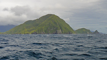 From the anchorage we could see a tall mountain which rises over 1200 meters straight out of the water. In no hurry at all, the anchor wasn't raised until 1145 the next morning. The sky, water and mountains were all shades of gray as misty clouds hovered about the valleys and canyons. No colors punctuated the monochromatic landscape except those on our boat.