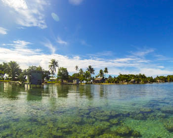 We head for Carola Bay in the south because it has the easiest access to the village. We dislike and distrust moorings but use them where there is coral or if requested by the locals. There are three moorings here and we chose the beefiest looking one. It is close to the reef and has a long, thick line that floats an entire boat length. No sooner have we strung our lines through it than a squall hits and blows up to 27 knots. I wait at the bow in the pelting rain watching the line and our position to shore to be sure we don't blow back onto the reef while Jim is inside doing all our arrival stuff. In an hour it's all over and we haven't budged. We are concerned that the line is so long, the reef is close and we are blowing that way. But all seems okay so we set the anchor alarm and go to sleep. We'll reassess in the morning. It is Sunday, Sept. 15. The next morning Johnny comes out. His father was the first guide and set these moorings. He assures us ours is a big concrete block but he dives on all three to be sure the ropes are still strong. They are. We relax and settle in. That evening he brings us two painted crayfish and we give him a mask a friend left on board.