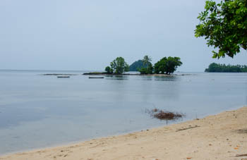 The Hermit Islands are surrounded by an outer reef and the island of Luf, our destination, is wrapped in its own reef while other bits of reef are scattered about. The coral is beautiful and easily visible in the clear water on a nice day. We hope for good light when entering the lagoon but it is overcast and we see dark clouds on the horizon and hear thunder. The island is shaped like a barbell with bays on both sides of the narrow bar. The village is built along this low section while hills bursting with palms and other trees billow at each end.