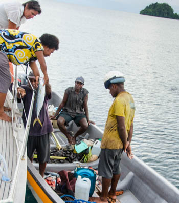 The next morning Baxter and Lorraine paddle out to greet us. Usually the local guide does this but he's at Ninigo with most of the other young men from the village. It is Independence Day and they are playing soccer. We ask Baxter and Lorraine about buying diesel and they say Matthew will be leaving shortly for Manus Island and will be back in two days. They leave to ask if he will get fuel for us and a short time later he zooms up and takes our 4 jugs and 320 kina, saying he will return Wednesday. I give the group on board a bag of Werther's lollies for the trip. Jim frowns, they are his favorites.
