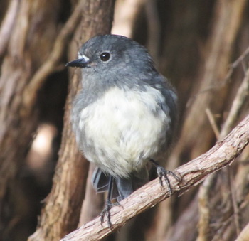 Stewart Island Robin - Track to Mason Bay Native. Found only in New Zealand. Not common. Three subspecies, one for each main island. Friendly and curious. Hops about on the ground in search of insects and worms. Several flew from branch to branch at eye level as we hiked along the trail. They stayed as long as we stayed, looking at us often hopping to the ground and right up to our feet. Adorable creatures that we just love! Unrelated to the robin red-breast. Can live more than 16 years.