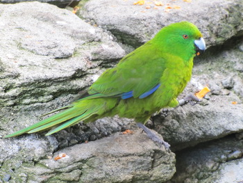 Red-Crowned Parakeet - Ulva Island Native. Common in places. Often flies above the canopy or side-slips through the trees. Rare in native forests on main islands but common on Stewart Island and predator free islands. Indeed, we saw, and heard, two at Ulva Island.