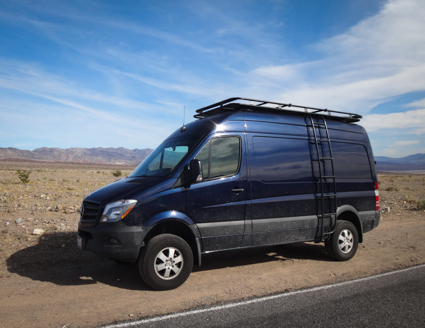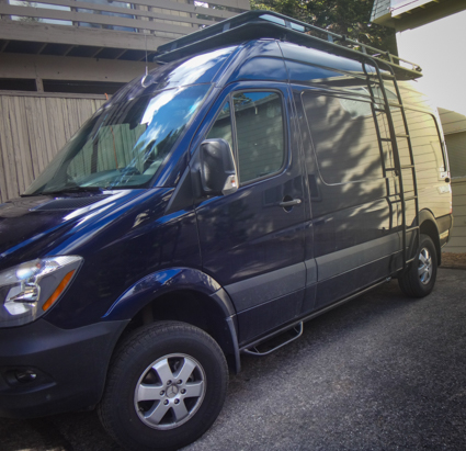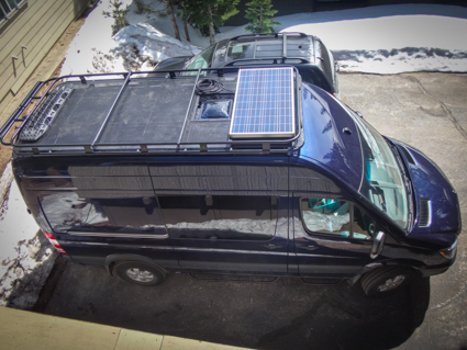 Aluminess extended the kayak rollers to protect the van's back-up camera. They also built crossbars to precisely fit our solar panel.