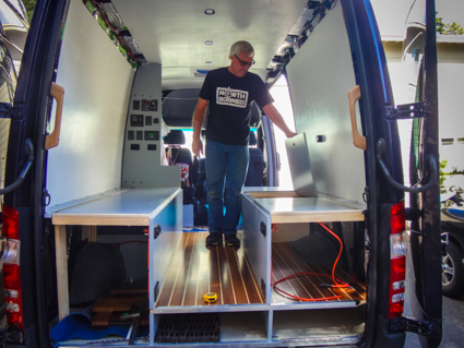 Another thing we carried over from the boat was a large storage locker for dirty or wet gear. On Tenaya, this was our cockpit locker. In the van, it is a deep drawer just inside the sliding door, under the starboard bunk. It's the perfect place to store shoes, daypacks, and dirty laundry.