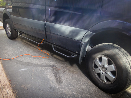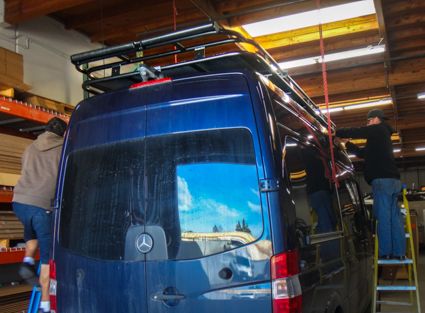 Aluminess extended the kayak rollers to protect the van's back-up camera. They also built crossbars to precisely fit our solar panel.