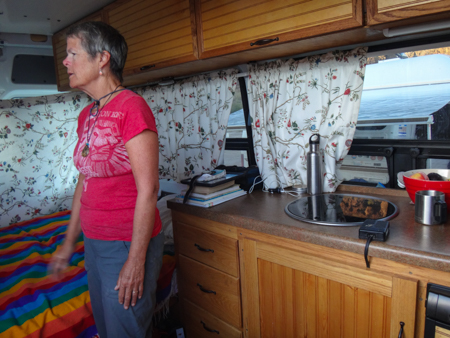 The galley runs fore and aft on both sides of the van which Janet really likes. Again, they love their microwave. A toilet and shower floor are hidden beneath a starboard counter. He designed the locker doors to rest on the outsides of the frames, a different solution to squeeking. There is a water tank under a portside bunk. Often they have to fill it using jugs.