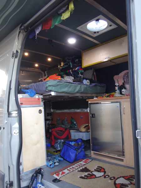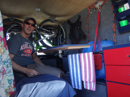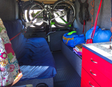 It's always interesting to see how people store their bikes inside and make the living space work. Derek and Kim hang their bikes upside down from the ceiling near the back doors and slide the futon below. During the day they push half up the wall and secure it with webbing to create a couch.