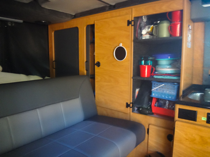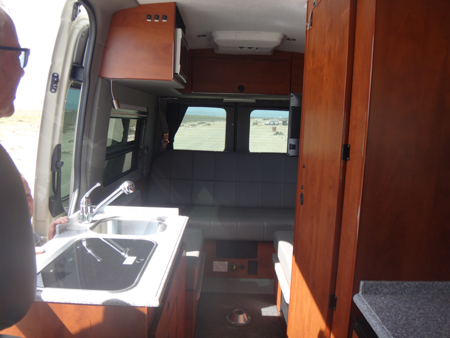 Their interior was layed out differenly than other Sportsmobiles we've seen. The sink and cooktop are on the side with the sliding door. Across from it is the toilet/shower, and the couch that folds into a bed is aft with two bench seats, a microwave and plenty of storage.