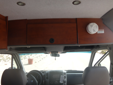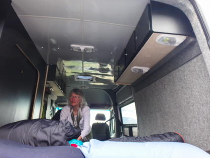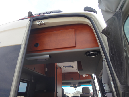 There is a big storage area above the bed that is accessible from either inside or when the rear doors are open. There's another enclosed storage area above the driver and passenger. Lights mounted below shine directly on each seat.