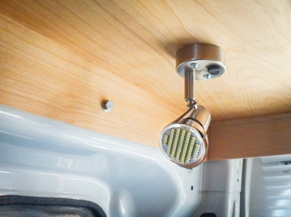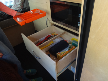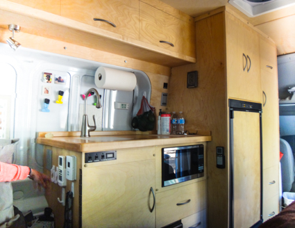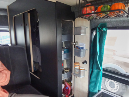 What are their favorite bits of kit? The microwave and built-in shower! He designed the locker doors to open upward and lock in place. There are gaps between the doors and frames to eliminate squeaks when the van moves.
