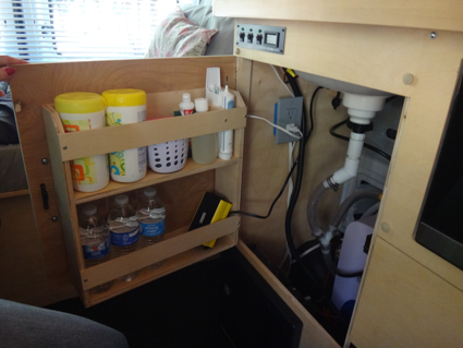 Cindy loves the pantry Smoky built in the galley. Check it out! The fixed baskets under the high lockers are a great idea for fruit.