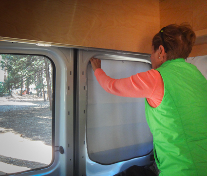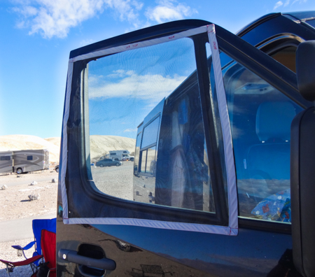 Gabby made window shades from Reflectix that attach with magnets. They are light and store away easily. She made a large one for the windshield too.
