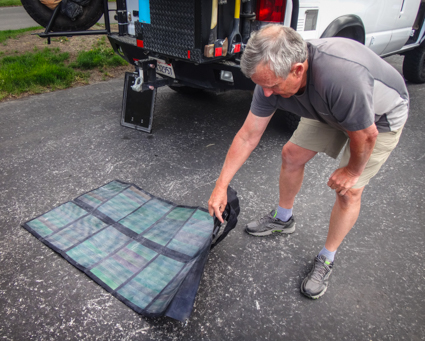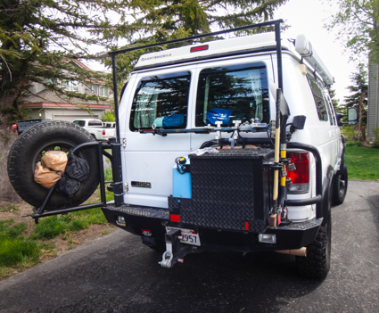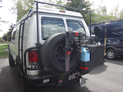 Their Aluminess back bumper holds tire chains and tools. The box holds foldable Global Solar panels (62W) that plug into a spot under the port side rear light, and more tools. Orrin added a high bar to the bumper for kayaks.
