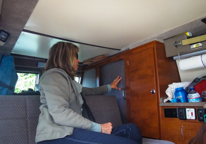 I wish I had more photos... Mark gave us the idea to put a shelf above the driver's and passenger's seats. We hadn't seen that before. His looks really nice, ours will probably be more basic.