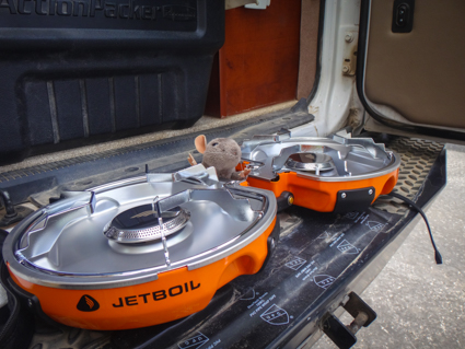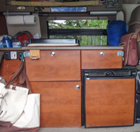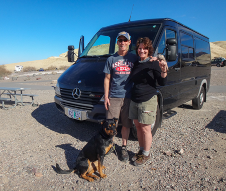 Hints from Orrin: Install a battery isolator to use any battery to start the van. A second fridge is nice and Dometic and ARB make energy efficient 12V/120V models. Most days they use a Camp Chef Outdoor Oven with 2 burners and they've added a small Jet Boil Base Camp 2 burner stove; both are propane. A light in the bumper and one on the rear quarter panel are useful. They have one water pump with hoses that go to the sink and the water heater in the back where their shower is located. Buy a locking Tuffy brand metal box for valuables.