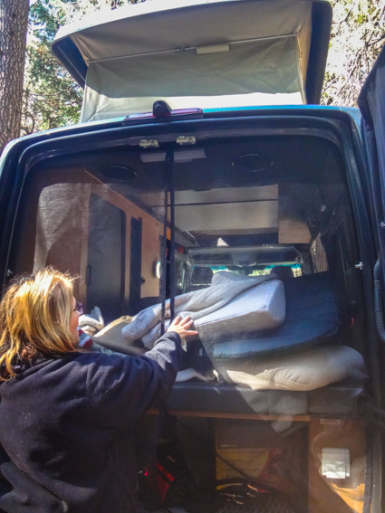 Shortly after settling into our site in North Pines campground in Yosemite, we spotted a Sportsmobile Sprinter pop-top nearby. Next thing you know, Cynthia invites us to have a look and demonstrates how the couch folds into a bed, how well the black plastic latches and sliders on the drawers work, where the Porta Potti hides, and the thick, soft curtains that snap into place when closed. She loves the pop-top option for having friends aboard, the snap in bug screen for the back door and, well, everything about her 2015 Sportsmobile.