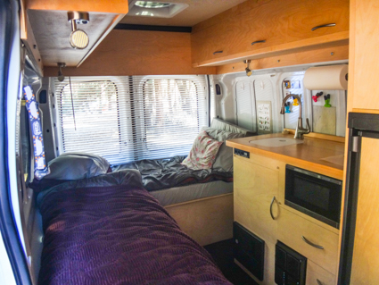 They travel with mountain bikes, SUPs and climbing gear so their van has to be versatile. Their bed is mounted high and it folds up against the wall for more room.