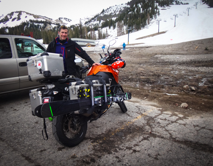 Slight deviation from Sprinters... We met Ian in the Chair 2 parking lot at Mammoth. He is on a three week backcountry skiing trip, working his way down from the Cascades on his motorcycle. And we think we are traveling light.