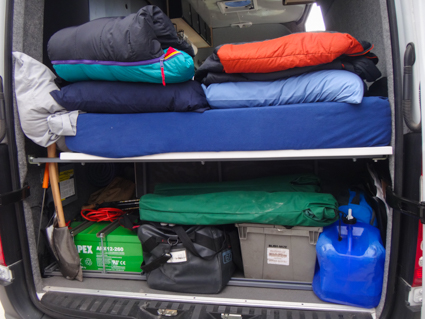 Because John and his wife travel with nice toys, they need to lock them inside their hightop, long wheelbase Sprinter. He designed their bed in two halves that fold up against the wall, mattresses and all. The bedding is stored in attached hammocks and there is storage beneath.