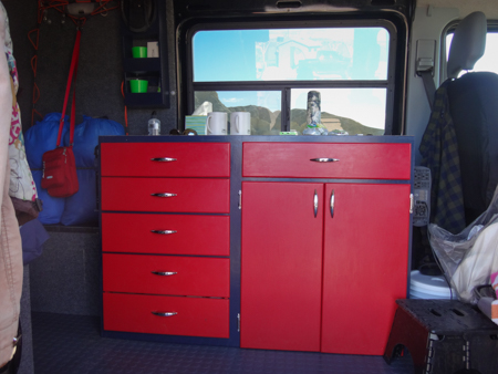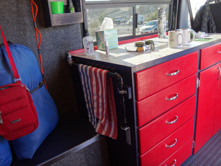 Derek and Kim were parked near us at Texas Springs Campground in Death Valley. They were on their maiden voyage in their 2006 LWB Sprinter which had been a coffee delivery truck. Derek repurposed a desk from a school demolition to use as their galley. Just cut it down to size, painted it red, and bolted it in.